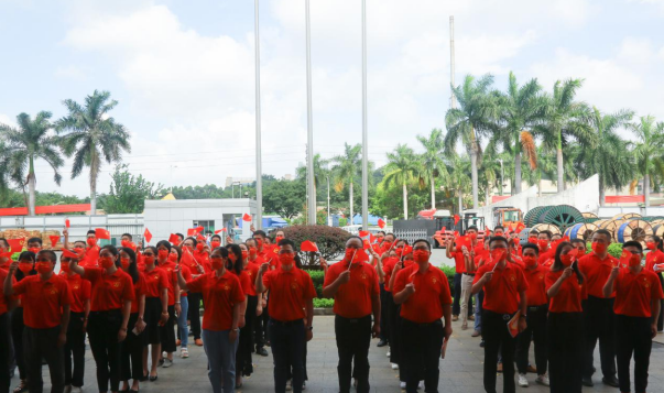 盛夏七月,热情似火!3003新葡的京公司已是党旗飘扬,处处洋溢着喜庆祥和的气氛。当日上午,身穿“中国红”T恤的党员等参会人员有序入场,列队数字“100”庆祝图案,表达对中国共产党的无限热爱。随着主持人一声令下,伴随着激昂雄壮的国歌声,护旗手奋力将鲜艳的五星红旗抛向天空,国旗迎着清晨第一缕阳光冉冉升起,全体人员庄重注视国旗,高唱国歌,脸上写满了骄傲与自豪。
